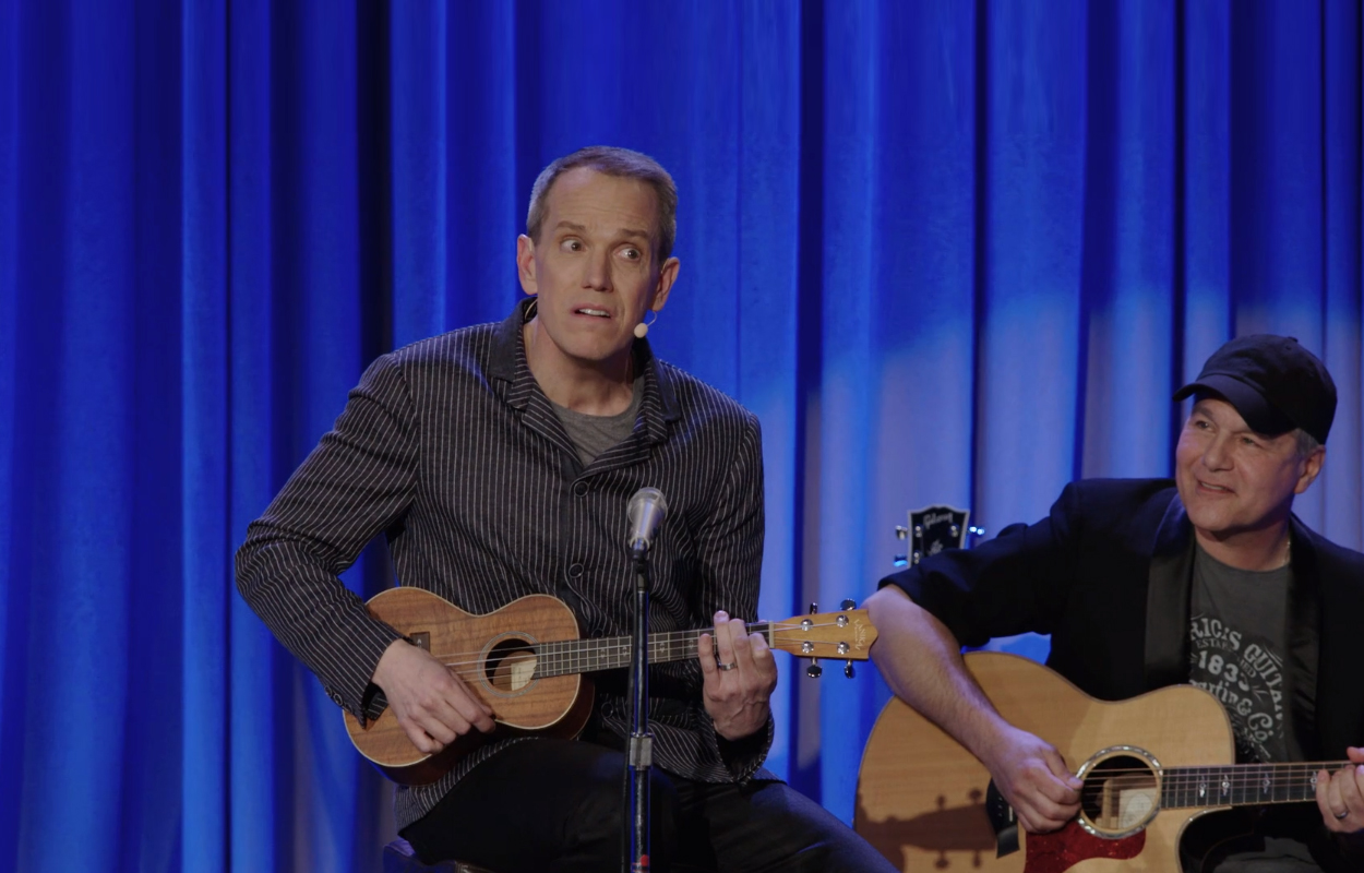 Rob Skinner points to guest in theater